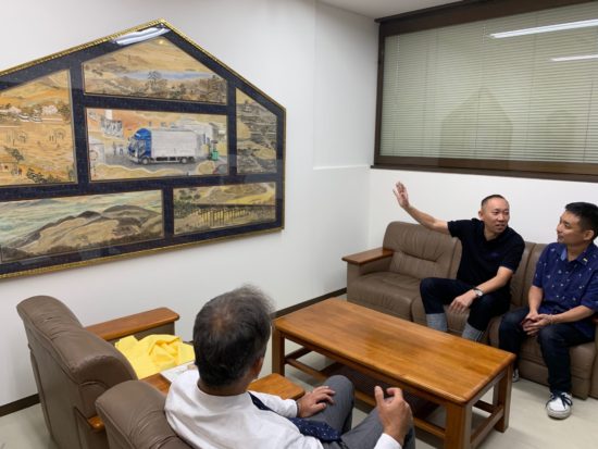 京産オリジナルの絵が本社にやってきました お知らせ お知らせ 未分類 | 2019.09.12 日本画家戸倉様にお願いをし、弊社の応接間に飾る絵を描いていただきました。 迫力のあるサイズで、殺風景だった応接間がパッと明るくなったように感じます! この絵は、弊社のこれまで、今、これからが6つの絵で表現されており、見れば見るほど味わい深い作品となっています。 戸倉様は一度弊社の屋上に登り風景を一望され、情景を表現されました。素晴らしい絵を描いていただき、本当にありがとうございます。 この絵を多くの方々に見ていただけますと幸いです。