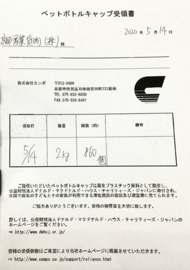 まずは、5月14日に初回で2kg(860個)を寄付させていただきました。