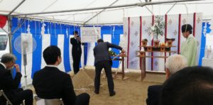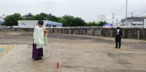 新倉庫地鎮祭 お知らせ 未分類 | 2020.08.03 7/26(日)大安 新倉庫の地鎮祭が執り行われました。 いつもなら祇園祭の宵山に梅雨明けしている頃なんですが、今年は梅雨が長く今日も天気予報は雨マークですが、なんとか降られずに地鎮祭ができました。 御来賓には工事関係者のほかにニプロ様にも来て頂き有難いかぎりです。 本社の駐車場だった場所に新しい倉庫が建ちます。 完成予定日は2021年4月中頃を予定しています。