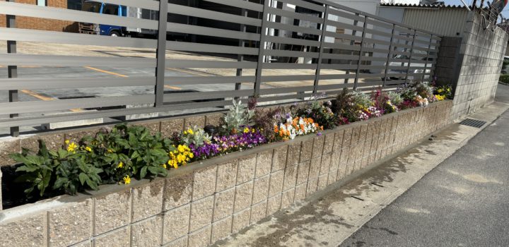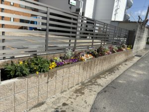 その本社周りつながりで・・・本社周りの一部の壁にヒビが入っていたので工事をして頂きました。その時に花壇を作って下さってその花壇を取締役(社長奥様)が手入れをして下さっています。 道に面したところにある為、通られる方やご近所の方等に喜んでもらえるようにと、お花の種類もかえて工夫されておられます。 当社は運送会社なのでイメージが「おっさんやむさくるしい等」思われているかもしれないので、そのイメージを一掃しやわらかいイメージになるようにと考えて下さっています。先日まで、パンジーやストック、クリスマスローズを植えていましたが、これからの季節はペチュニアやユーフォルビア・トレニア等を植えられる予定です。 花壇の手入れをしている時にご近所の方に「きれいねぇ」と声をかけて下さることもあるそうです。 是非一度、花壇も見に来て下さい!