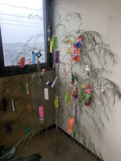 七夕の飾り付け お知らせ お知らせ | 2018.07.06 今年も七夕の飾り付けを行いました。谷さんの知り合いのお寺さんの裏山の笹を頂きました。(勝手ではないですよ)皆で飾り付けが終わった後、短冊に思い思いの願い事を書き飾りつけました。みんなの願いが叶えばいいのになぁ~(今年は大雨で玄関ホールに飾っています)